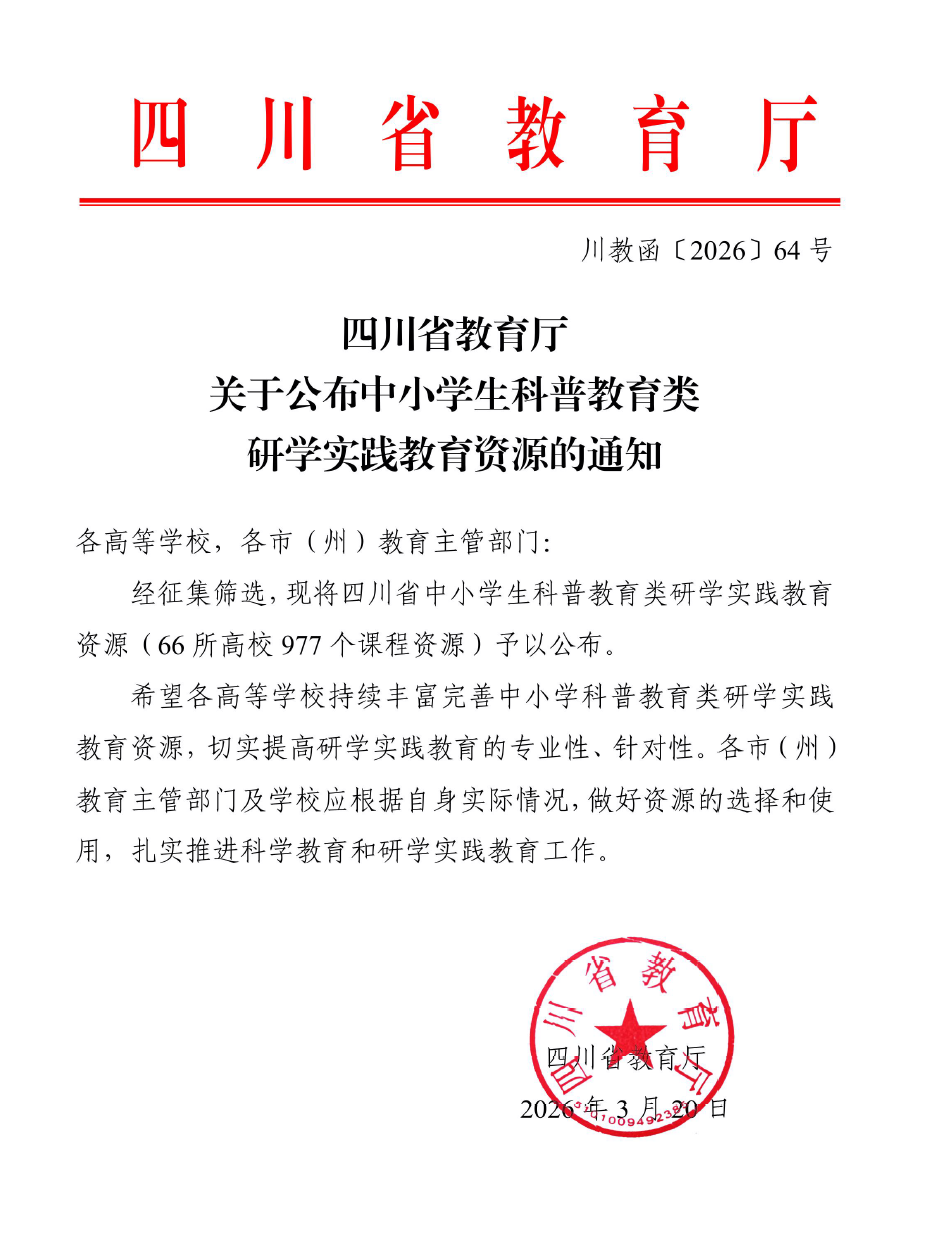 3月20日,四川省教育厅发布了《关于公布中小学生科普教育类研学实践教育资源的通知》(川教函〔2026〕64号)。经单位申报、专家评审,我校申报的《从沙粒到芯片》《数学3D建模》等8项课程资源成功入选“四川省中小学生科普教育类研学实践教育资源”名单,标志着我校优质教学资源正式面向全省中小学生开放,服务基础教育科普工作迈上新台阶。