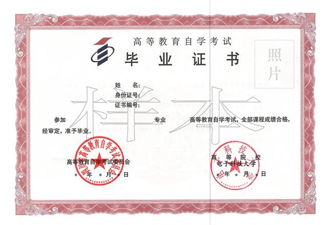 我校举办的高教自考助学学员修完考试计划规定的全部课程,且各科考试成绩合格,将获得由高等教育自学考试委员会颁发,电子科技大学副署校印的毕业证书,国家承认学历,由四川省教育考试院统一进行毕业生电子注册。