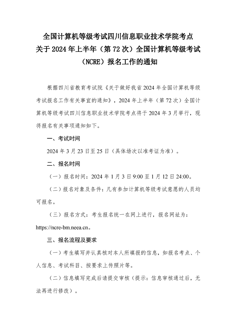 关于2024年上半年(第72次)全国计算机等级考试(NCRE)报名工作的通知