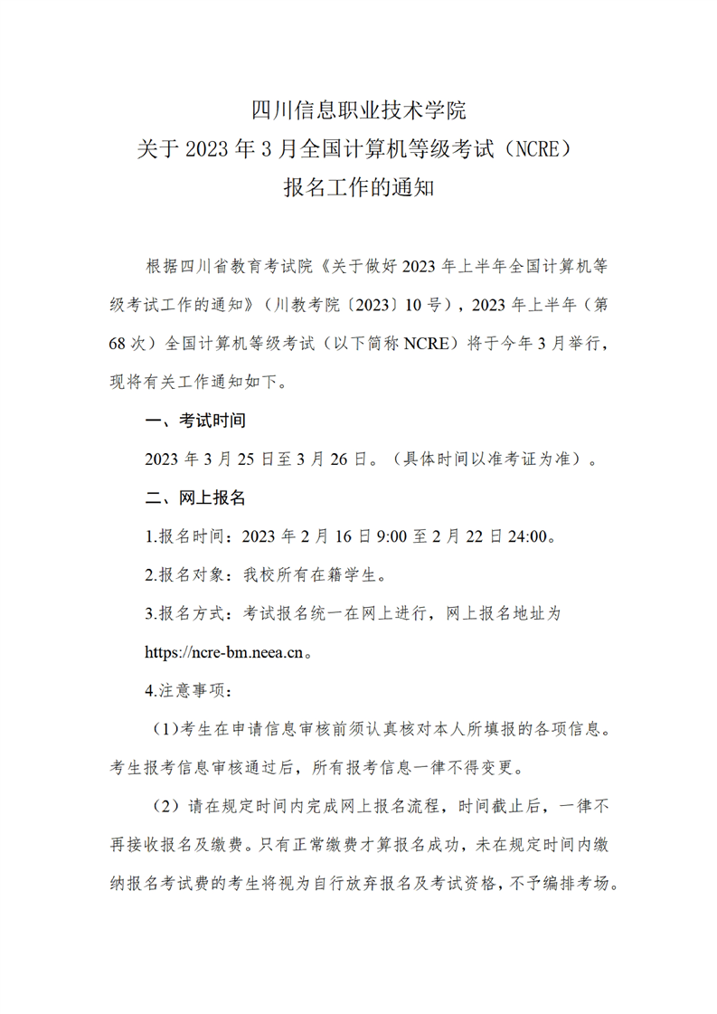 关于2023年3月全国计算机等级考试报名工作的通知